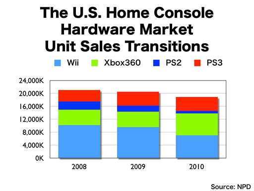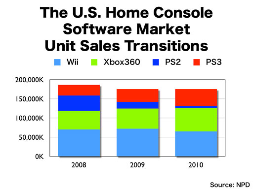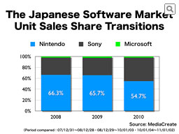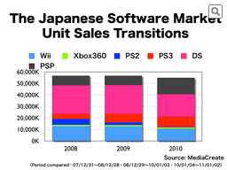 When we focus upon the Nintendo DS software sales, however, due to factors such as there were no other great hit titles than "Pokémon Black" & "Pokémon White", the 2010 sales were less than those of 2009.