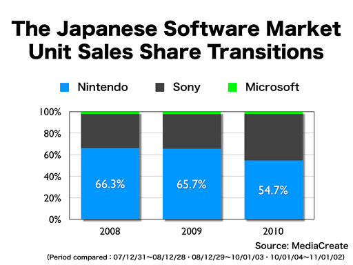 Now, we are looking at the software unit sales share transitions in Japan by the hardware manufacturers. Due especially to the change in the handheld software unit sales share transitions, Nintendo’s overall software market share showed a decline.