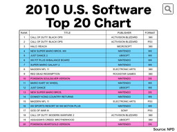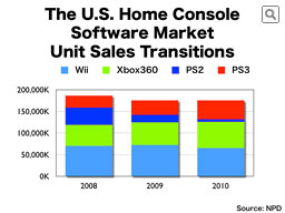 Eleven titles for Nintendo platforms hit the chart, including “New Super Mario Bros. Wii”, “Wii Fit Plus”, “Mario Kart Wii”, “JUST DANCE” and “Wii Sports Resort” for Wii as well as “New Super Mario Bros.” for Nintendo DS, and these six titles were all launched in previous years. On the contrary, for the other companies’ platforms, “Call of Duty: Modern Warfare 2” was the only title which was launched in the previous year. Nintendo platforms, for which a number of long-sellers exist, stand in sheer contrast to other companies’ platforms, for which most of the sales are completed in a fairly short period of time after the software’s launch. One difference from the Japanese market situation is that most of the multi-platform titles are selling more on Xbox 360 than PS3.
