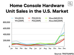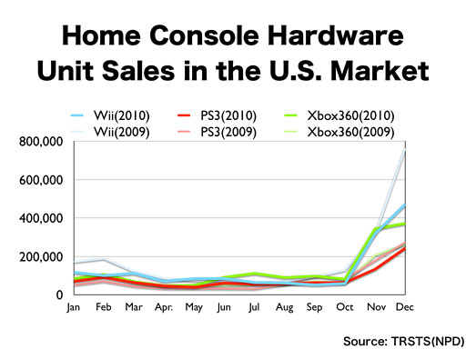 When we look carefully at the weekly sales transitions, we can notice that the sales situation has changed since the launch of the red Wii hardware which was launched to celebrate the 25th anniversary of Super Mario Bros. After the launch, specifically from the Thanksgiving holidays, the sales largely increased. The unit sales of Wii in the U.S. in December 2010 could not reach those in December 2009, but in the previous year, Wii had made a record single-month sales in the U.S. video game market by selling more than 3.8 million units in December 2009 alone. Wii sold more than 2,350,000 units of hardware in December 2010, which was better than December 2008, when Wii was selling very well. As a result, Wii was able to establish another record in the U.S. home console market by selling more than seven million units in the U.S. in three consecutive years.