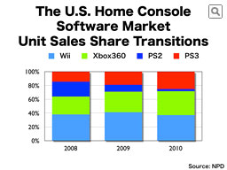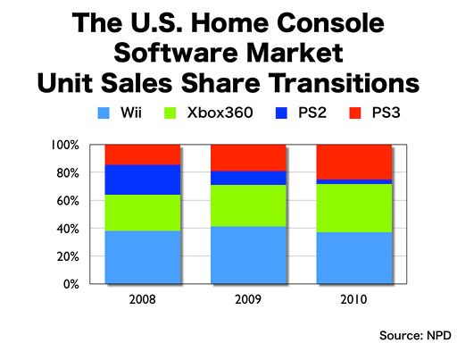 When we look at the software unit sales market share, Sony’s share remains to be almost the same with 2009 as the decrease in PS2 software was offset by the increase in PS3 software. Wii software unit sales decreased a bit, which increased Xbox 360’s software share.