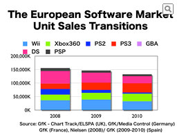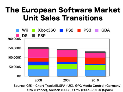 This chart combines the software sales for both home consoles and handheld devices. As I said before, the handheld software showed a decline while the home console software kept level with the previous year. As a result, the entire software market in Europe saw a decline.