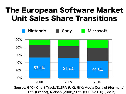 Affected by the change in the Nintendo DS software market, Nintendo’s software sales share in Europe, which surpassed the U.S. result in 2008, was lower than that in the U.S. and in Japan.