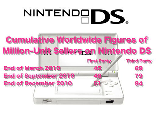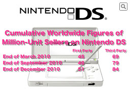 As of the end of last year, the number of Nintendo DS titles which had shipped more than a million units since their launches increased by five from first-party developers, which include Nintendo and The Pokémon Company, to come to a total of 51, and by five from third-party developers to equal 84.