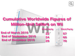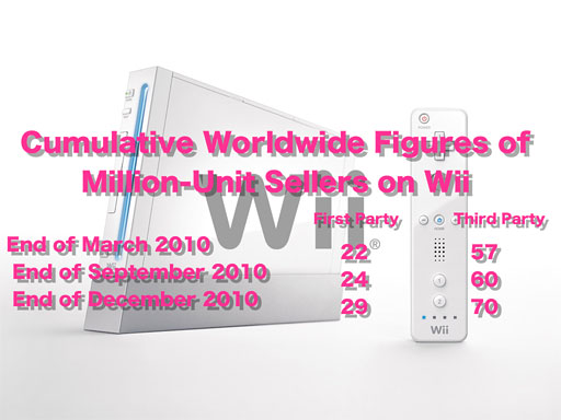 As for Wii, the number of Wii titles which had shipped more than a million units increased by five from first-party developers, which includes Nintendo and The Pokémon Company, to reach a total of 29 and by 10 from third-party developers to make it to 70.