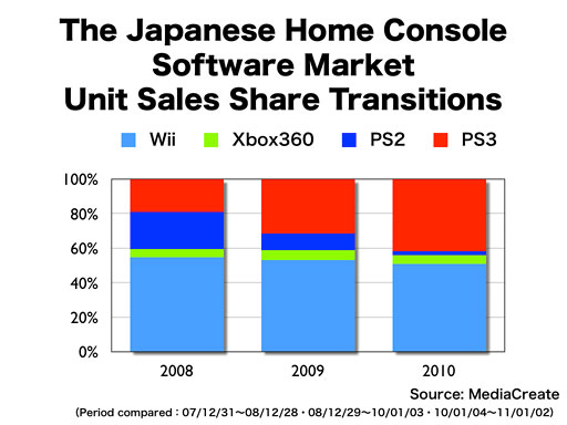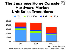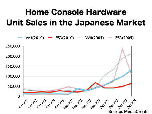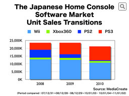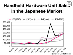Having said all this, however, "New Super Mario Bros. Wii" was sold explosively and PS3 had "Final Fantasy" in the corresponding period in 2009 for home consoles, and, as I will discuss later, Capcom launched its new "Monster Hunter" title for the handheld hardware, PSP, at the end of 2010. Overall, the home console market in Japan in 2010 could not create the excitement that the industry had experienced in the 2009 year-end sales season.