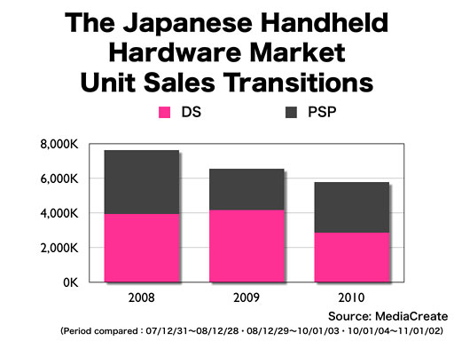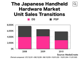 Now that six years have passed since the launches of Nintendo DS and PSP, and as Nintendo was not able to launch Nintendo 3DS by the end of 2010, the calendar-year sales were less than those of 2009. When compared with 2009, Nintendo DS showed a decline, And even though such elements as the success of "Monster Hunter" increased PSP’s unit sales, when we compare the 2010 result with that of 2008, both platforms show approximately 20% declines.