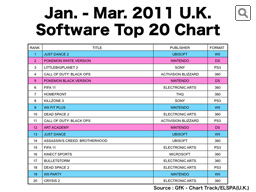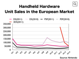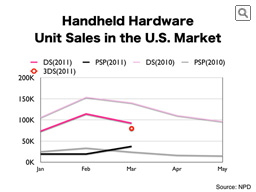 The handheld hardware sales showed a decline over last year since the launch of Nintendo 3DS was coming up in March. Sony's PSP also showed a decline over last year but enjoyed a slight increase in March due to a price cut in late February. The overall situation contrasts greatly to that in Japan.