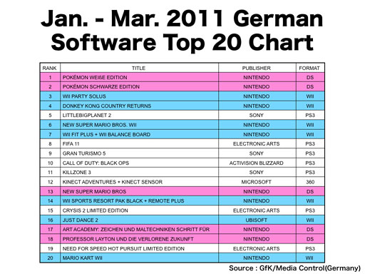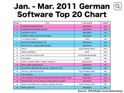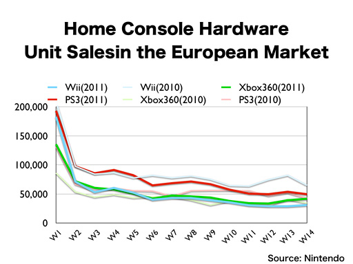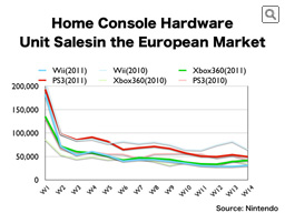 The top positions of the software hit charts are lined up with major titles for Wii for last year's year-end sales such as "Wii Party" and "Donkey Kong Country Returns." "New Super Mario Bros. Wii," "Wii Fit Plus" and "Wii Sports Resort" are also positioned at the top. Also for Nintendo DS, the "New Super Mario Bros." title that was launched five years ago, "Professor Layton," which was launched last year, and "Art Academy," the software known as "Egokoro Kyoshitsu DS" in Japan, have maintained consistent sales. Similar trends can be found in many countries in Europe.