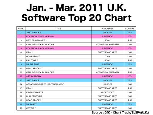 Ubisoft's headquarters is located in France, and its "JUST DANCE 2" is ranked in second place.