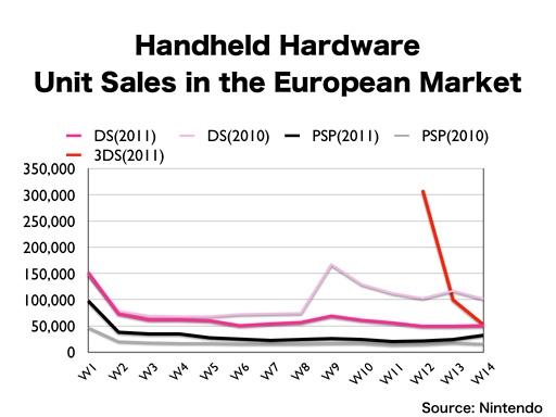 There is only a week's worth of data for the Nintendo 3DS sales in March. There are five weeks in March for data purposes and, therefore, please acknowledge that the point in the graph indicates one fifth of the initial week's sales. Nintendo 3DS started very well but, on the other hand, did not perform as expected after the second week.