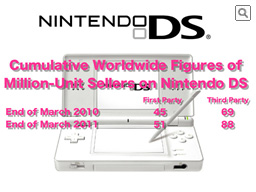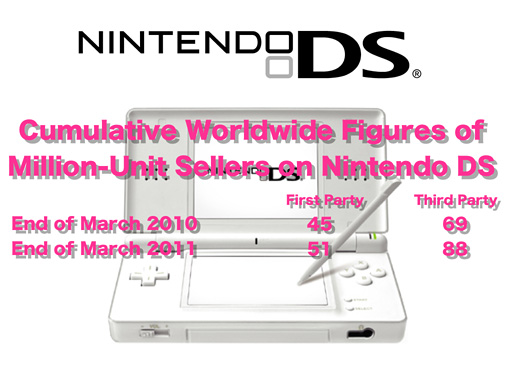 As of the end of last fiscal year, the number of Nintendo DS titles which had shipped more than a million units since their launches, reached 51 for Nintendo and The Pokémon Company, and 88 for third-party developers.