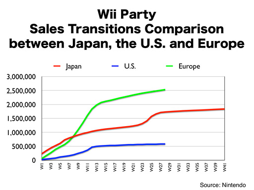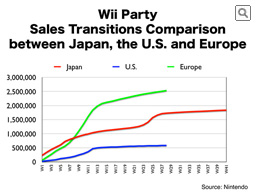 Even after the turn of the year, the sales in Europe, shown in green, are steadily growing. This indicates that it has established its position as software that sells continuously, like "Wii Fit" or "Wii Sports Resort," which became representative titles for Wii, so I assume that the possibility of "Wii Party" selling on a long-time basis has grown.
