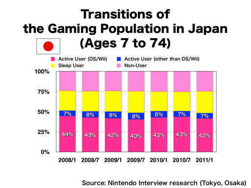 The research in January this year showed a decrease in the blue part of this graph, which is the number of active users in Japan, and the number of sleep users increased, which means that the gaming population decreased even though it was right after the year-end sales season. And, when we color-code the number of people who are enjoying Nintendo DS or Wii,