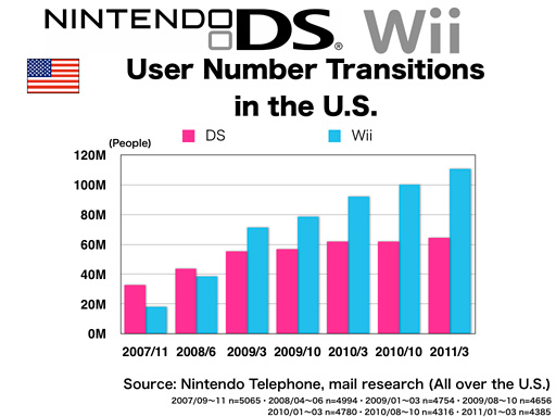 From this graph, you may be able to see that, especially, the number of the consumers enjoying Wii is steadily growing in the U.S. I think one reason is the impact of the hit of the dancing games which have not caused a movement in Japan yet, and another reason is that the consumers in the U.S. do not stop playing games easily, and they tend to search proactively for the next game to play. In Japan, 56 Wii software titles were released in fiscal year 2010, but the number was 245 for the U.S., which clearly shows the big difference in the situation. We cannot simply compare the two markets by the number of software titles released, but from the perspective of whether we are answering the various trends of Wii users, there might be some causal relationship.