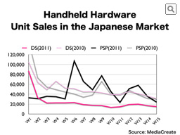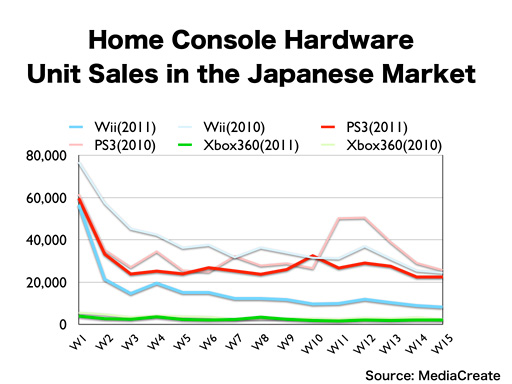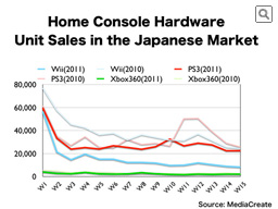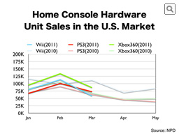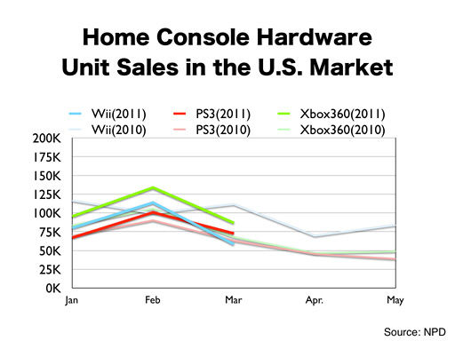 The deep colors are for 2011, and the lighter colors are for 2010. At the end of last year, Wii was leading the market, but it was not able to maintain that momentum after the turn of the year. On the other hand, Microsoft's Xbox 360 has kept its sales momentum since late last year. One assumption for this contrasting result is due to the behavioral characteristics of the consumers purchasing the hardware: consumers buying Wii today are more seasonally influenced.