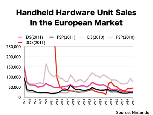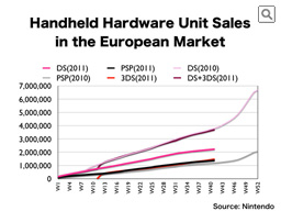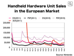 Here is a comparison of the sales of handheld hardware units in Europe compared to those of last year. The sales of the Nintendo DS turned out to be lower than those of last year because the Nintendo 3DS was released in March. However, similar to the situation in the U.S., the Nintendo DS kept selling a certain number of units even after the launch of the Nintendo 3DS.