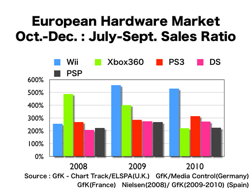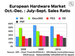 Compared to the U.S., the ratios for year-end sales are slightly lower in Europe; however, I think it is obvious that the Wii experienced outstanding growth in the past two years. Xbox 360 experienced high growth in 2008 and 2009 but this was due to an aggressive price promotion and the total number of sales was not so big.