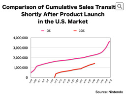 Although there is a difference in the situation because the Nintendo DS was launched in the year-end sales period and was able to create a solid foundation in those two months while the Nintendo 3DS was launched in March, the recent sales curve of the red line, which shows the sales of the Nintendo 3DS, is far steeper than what the Nintendo DS experienced at the same period. Also, considering that some leading Nintendo 3DS titles will be released at the year-end, we are expecting a far more exciting year-end sales season this year compared to the second Christmas sales for the Nintendo DS.