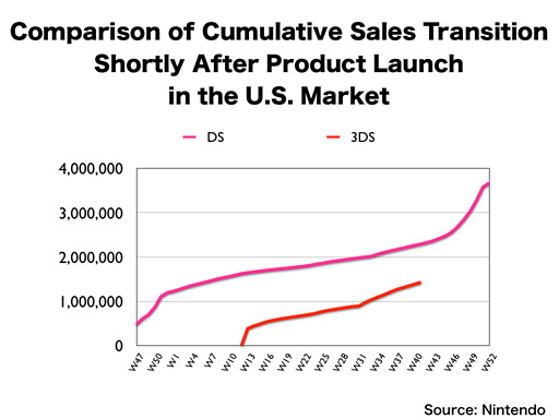 When we compare the cumulative sales transition of this year to that of last year, the chart looks like this. Similar to the situation in the U.S., the aggregation of the sales transition of the Nintendo DS and the Nintendo 3DS is almost the same as the sales transition of the Nintendo DS in the previous year. Regarding the sales growth at the end of the year, we are aiming to create more momentum than last year.
