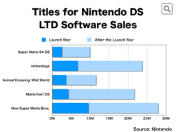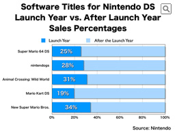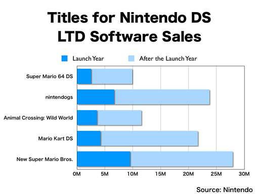 This graph shows the global life-to-date sales of several Nintendo DS titles. The darker blue indicates the software’s shipment figure in the launch year, and the lighter blue indicates the shipments after the first year.