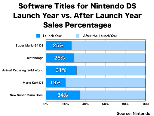 In percentages, it looks like this. What is especially notable is the low sales percentage in the launch year of “Mario Kart DS.” We launched “New Super Mario Bros.” two fiscal years after the original launch of the Nintendo DS hardware so that, at the software’s launch, a significant number of the hardware had been purchased. Yet, the launch-year sales constitute a rather small portion of its entire sales. I’d like you to understand that the Nintendo 3DS titles I just mentioned as examples that have the potential to make steady and continuous sales in the next fiscal year and beyond, will be able to provide support for the momentum of Nintendo 3DS as well as to contribute to the sales and profits.