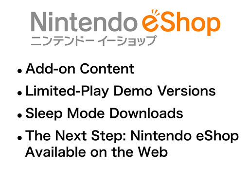 Iwata: This is a slide that I referred to in my presentation today. When we talk about “charging for items” and “add-on content,” the structure will be the same. More specifically, with the update of the Nintendo eShop scheduled for the end of November, a mechanism, with which the users can separately purchase inexpensive add-on items and content for a game they have purchased, will be incorporated. Maybe I needed to explain in more detail at the end of July this year, but what will be done by the end of this year is not only the publishers’ ability to provide consumers with add-on content but they will also be able to charge for such items. |