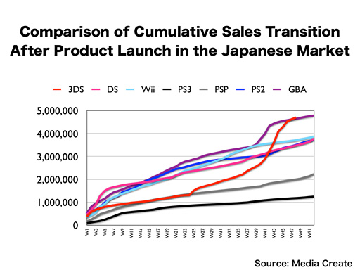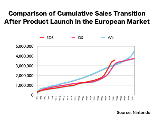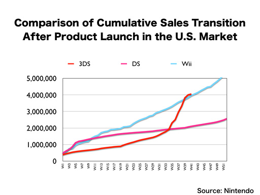 However, the sales pace of the Nintendo DS was not very good in its first year in the U.S., so we cannot say “The Nintendo 3DS is selling steadily,” just by the fact that it is selling at a faster pace than the Nintendo DS. This is the sales transition of the Wii, and the total unit sales of the Nintendo 3DS exceeded those of the Wii at the end of last year.