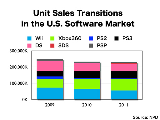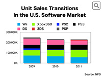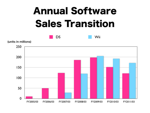 Iwata: This chart shows the transition of the Nintendo DS’s and the Wii’s software shipment numbers in each fiscal year. As I said that the third fiscal year is important, each platform shows a sales jump in their third year. When a platform can show such an increase, the entire platform business can significantly grow, so we recognize that the third year is very important. Although in the case of the Wii, we were able to create an explosive boom around the world even in its second fiscal year, in general, around the third year we usually see a good balance between the proliferation of the hardware and good sales of applicable software. This is one viewpoint with which we see the market. Of course, each platform has its own consumer characteristics and market environment, so I am not saying that we always see a transition like this. Please just take this as an example of the structure of a good game platform business. Regarding your remark on Capcom’s "Monster Hunter 3 (Tri) G," (Japanese title) making a change in the Nintendo 3DS’s user demographics, you are exactly right. The number of Nintendo 3DS users who think of themselves as skilled game players is increasing. Also, the number of male Nintendo 3DS users in junior high school, high school and university is increasing. I believe I have previously shown you a pyramid chart of Nintendo DS’s and Wii’s user demographics, which showed surges in children and their parents’ age demographics, and between which was a dip, so that it looked like a two-humped camel. I think that dip is now being significantly filled. For years, Nintendo’s video game platforms have had an almost equal split between male and female consumers but, probably with such a background, the male-female user composition for the Nintendo 3DS at this point in time must be about 6 to 4 in favor of male users. Of course, there are a large number of female users of the product, but the ratio is more male-favored at present. In the overseas markets, the main battlefield for third party publishers is the home console market. As you once again look at the graph that I showed you today, you will notice that a higher ratio of software sales is generated on home consoles. As the result, the major western publishers tend to put more priority on developing their software for home console systems. On the other hand, now that they were able to confirm the Nintendo 3DS’s marketability in the just-finished holiday sales season, their attitudes are gradually changing. Also, until such software from the overseas publishers pours into the market, the Japanese software makers have a great business opportunity, I believe. This is one thing that I often talk about with Mr. Hatano. If the company can cooperate with the Japanese software makers and increase the overseas sales of their quality software, we can prove to the others that the market is there for them and the Japanese software makers will be able to expand their markets. Therefore, if we can do so, there will be a number of advantages. In other words, the important factors are: One, such titles will be launched by the western software makers and succeed in the market, and: Two, Nintendo and the Japanese software makers will effectively cooperate so that their titles will sell well outside Japan. As for the "Touch-Generations" titles for the Nintendo DS, as many of you recognize that these titles were able to gain popularity among different consumers and to expand the total number of consumers for the hardware, we often receive such questions as "Why don’t you do the same for the Nintendo 3DS?" If the company was to simply port these "Touch-Generations" titles to the Nintendo 3DS, there would be nothing fresh. Although we have not included the software in the lineup that we have announced so far for this year, we are, of course, preparing several titles with which we will be able to aim to expand the entire gaming population. By releasing these titles in the market, and by linking them with other network activities of the company, by taking advantage of such communications among friends as "Swapnote" or interactions in public enabled by "StreetPass" communication, if we can beef up the joy of the software, and if we can communicate to consumers the brand-new experiences such software can deliver, I believe we will certainly make a change. For example, in comparison to the Nintendo DS and the Wii, fewer senior consumers are using the Nintendo 3DS today. It must be inevitable as there are few titles among the Nintendo 3DS software so far developed with this age demographic in mind. The situation must change after applicable software is introduced. However, for the Nintendo 3DS, we have to first maintain the situation in which the current owners of the Nintendo 3DS will be satisfied. We cannot put too much priority on expanding the entire user demographic at present. It is important to maintain a good sense of balance here. |