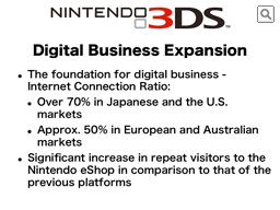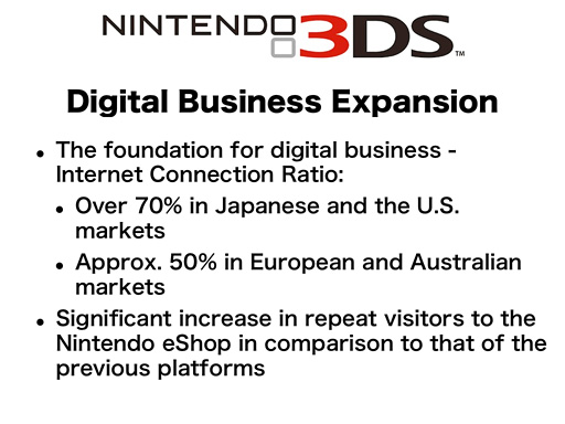 As I just said, the net connection ratio of Nintendo 3DS has grown significantly higher than that for other Nintendo handheld systems. The ratio of Nintendo 3DS owners who have visited the Nintendo eShop, as well as their visit frequencies, has also risen far above the level achieved by the Wii and the Nintendo DSi.