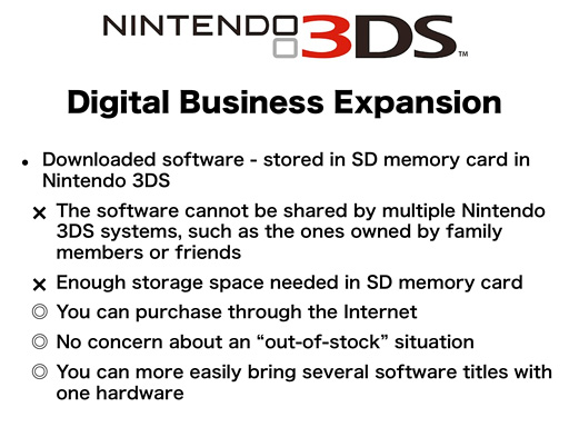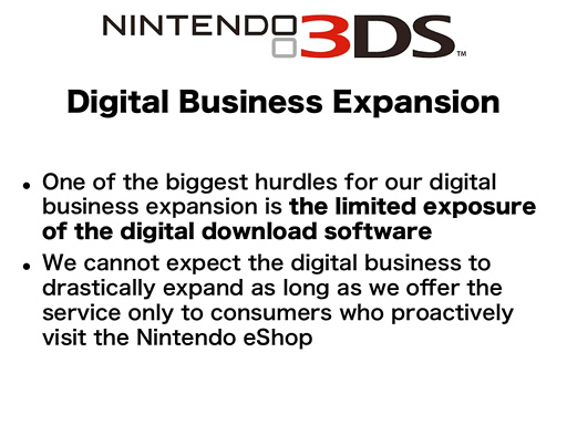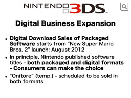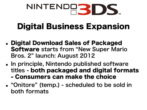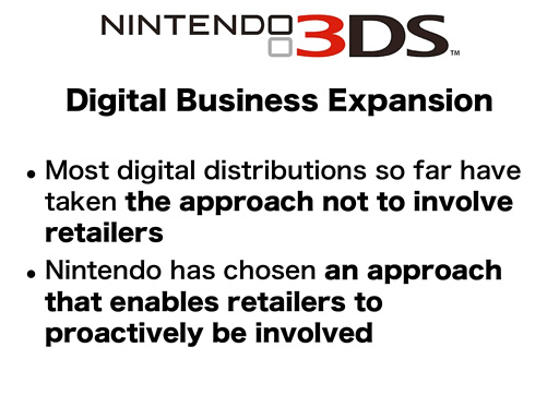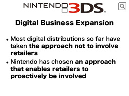 Of course, for all the digital download software, we ultimately need our consumers to download them to their Nintendo 3DS system through the Nintendo eShop. However, when it comes to how our consumers choose the candidates and make the final purchase decision, as well as how they pay for the software, we are going to enable consumers to go through these processes at both retailers and the Nintendo eShop.