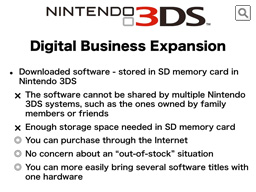 The digitally downloaded software will be stored in the consumer’s SD memory card and be playable only with the hardware to which it was downloaded so that, unlike how you can share the packaged software which are stored in game card format, the consumer cannot share the software with other Nintendo 3DS systems owned by other members of the family or friends. Also, vacant space in SD memory card is needed in order to store the digital download software. On the other hand, as consumers can purchase the software through the Internet, they do not have to visit the retail outlets, be concerned about an out-of-stock situation or even carry around multiple game cards in order to play digitally downloaded counterparts when they are away from home. Nintendo publishes various titles that enable you to enjoy daily communication, such as “nintendogs,” “Animal Crossing” and “Tomodachi Collection,” in addition to the ones like “Onitore” (temp.), with which you might like to practice every day, and database-type software like “Hana to Ikimono Rittai Zukan” (sold in Japan only). It must be easier for the Nintendo 3DS owners to feel the merit of being able to carry around only the Nintendo 3DS system with, in particular, these kinds of software titles stored inside. As for other kinds of software, users who like to play different game titles in turn on one Nintendo 3DS system should feel that this option is handy. Nintendo will ensure to properly explain to consumers the different merits associated with the packaged software and the digital download software so that they can make the purchase decision they prefer.