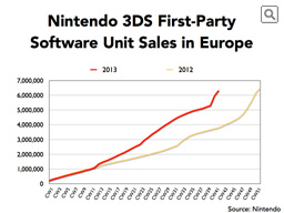 This is a graph for the European market which compares this year's sales transitions of first-party software for Nintendo 3DS to last year's.