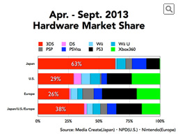 Some might feel it is odd that even though the market shares in the overseas markets are increasing, the sales units from Nintendo in the first half of this period were less than in the previous year. This is because, in addition to the relative nature of the market share, Nintendo 3DS XL was released in July in Japan and Europe, and in August in the U.S. last year.