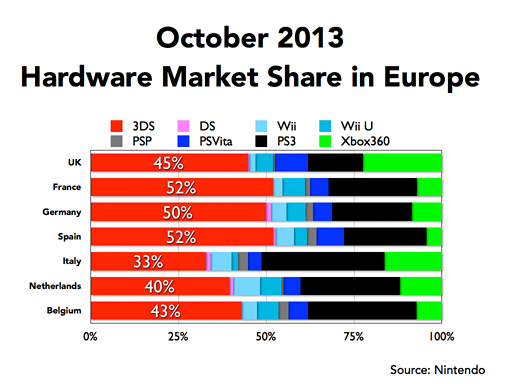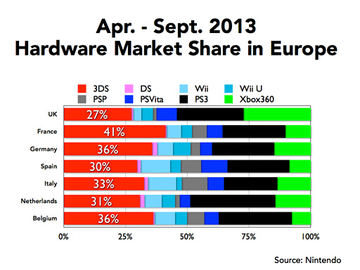 Compared with the data from January to March, which was shown in the Financial Results Briefing in April, the market share has increased by 8 percent in the UK, 12 percent in France and Germany, and the Nintendo 3DS market share has greatly increased in all countries. The market share in the UK, our main concern, has also improved, and there was a month in France that the monthly hardware share reached 50 percent, a presence that is as high as Nintendo has shown in Japan.