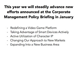 At the Corporate Management Policy Briefing in January, we referred to our new efforts to adapt to the changing business environment. Some of these efforts will yield results during this fiscal year; others need to be addressed over the medium term. Anyway, we would like to steadily advance each of them this year.