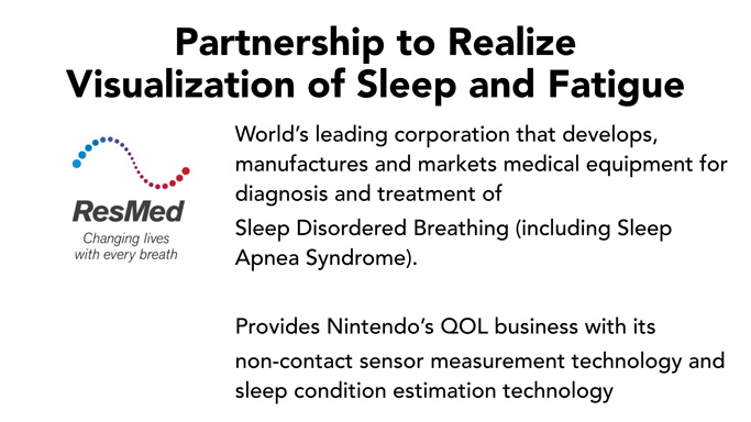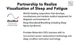 ResMed has been contributing to improving patients’ QOL in the medical equipment field by improving their sleep condition, and for Nintendo, a company that develops, manufactures and markets products for the general public, we think this partnership is a good fit as both companies can bring out each other’s strengths.