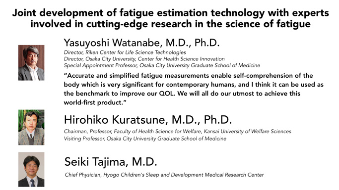 Dr. Yasuyoshi Watanabe is an expert in a wide variety of health-related fields, and his name is recognized in fatigue science around the world. Dr. Watanabe kindly provided us with his comment: “Accurate and simplified fatigue measurements enable self-comprehension of the body which is very significant for contemporary humans, and I think it can be used as the benchmark to improve our QOL. We will all do our utmost to achieve this world-first product.”