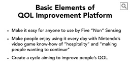 With Nintendo’s know-how of hospitality as well as of making people want to continue, we will encourage people to enjoy using it every day. As a result, a meaningful cycle will be established aiming to improve people’s QOL. These are the basic elements of our QOL improvement platform.