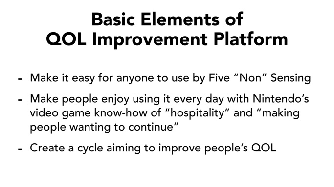 Today, I would like to spend some time to explain a little more about the QOL business that Nintendo will deploy. In January, I stated that the first theme of our QOL business would be “health.” Now, I would like to explain which aspect of health Nintendo’s project will focus on. I will also elaborate on my previous remark that it would be “non-wearable.”