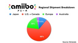 This pie graph shows the most recent regional shipment breakdown of amiibo. The U.S. and Canada, shown in red in the graph, have an overwhelmingly large 66 percent share, showing a tremendous presence overall.