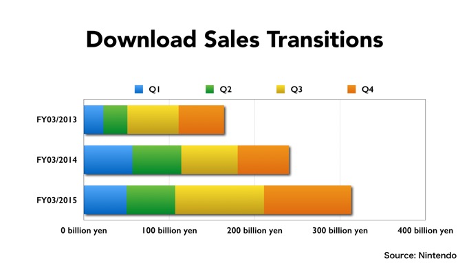 These graphs show the download sales transitions in the recent three fiscal years. In the just-ended financial year, following on from the third quarter, the fourth-quarter download sales grew dramatically and the total download sales for the full fiscal year reached 31.3 billion yen. The digital download sales increase of about 30 percent compared to the previous fiscal year should be mainly attributable to such facts as the sales of the digital versions of both the Nintendo 3DS and Wii U software increasing, especially in the overseas markets.