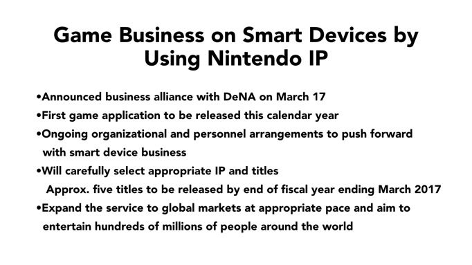 For one thing, in order to maximize the value of Nintendo IP, we are working to leverage opportunities that go beyond a traditional focus on dedicated video game systems. As you know, amiibo is one such effort. Also, we made the announcement that we will take advantage of smart devices. As smart devices are increasing in significance as the dominant window through which consumers connect with one another and with society, it is natural for us to leverage smart devices to communicate directly with our consumers.