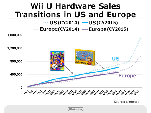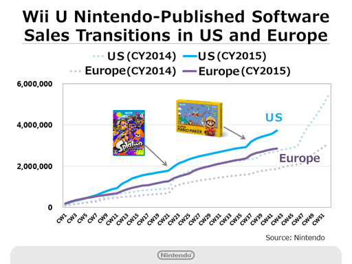 Due to the continuous sales of Mario Kart 8 and Super Smash Bros. for Wii U, both released last year, and the release of the two strong titles Splatoon and Super Mario Maker released almost at the same time as in Japan, the pace of sales is exceeding that of last year’s in the US and European markets as well.
