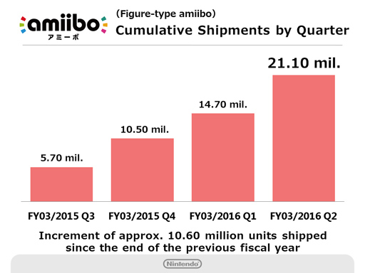 As of the end of the previous fiscal year, approximately 10.50 million units of amiibo were shipped. In comparison with the end of the previous fiscal year, shipments almost doubled with incremental sales of approximately 10.60 million units in the first half of this fiscal year.