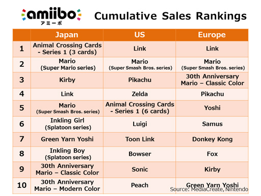In Japan, newly released amiibo have good momentum as amiibo compatible software and product recognition has increased. In the US, amiibo that were released in the past still continue to sell and one characteristic is that the ranking does not shift so much.