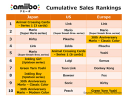 This slide shows individual amiibo characters sorted by cumulative unit sales from the end of last year’s launch to the end of this September for the Japanese, US and European markets.