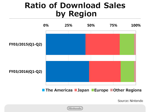 This is a ratio comparison of download sales by region up to the second quarter of the previous fiscal year and this fiscal year. The Americas, the blue part of the graph, accounts for just under 50 percent followed by Japan and Europe.