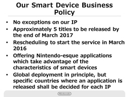Although we announced during the last Financial Briefing that we would release the first application by the end of this year, we have rescheduled it to be released in March 2016 with our aim to further improve the application and to optimize the overall smart device business.