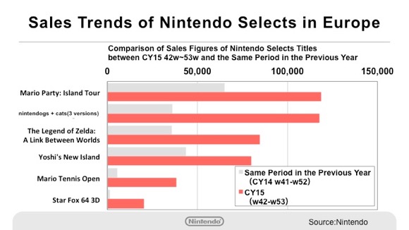 The red bars in this graph show the sell-through numbers of reduced-price titles called “Nintendo Selects,” which we sold in Europe starting in October last year.